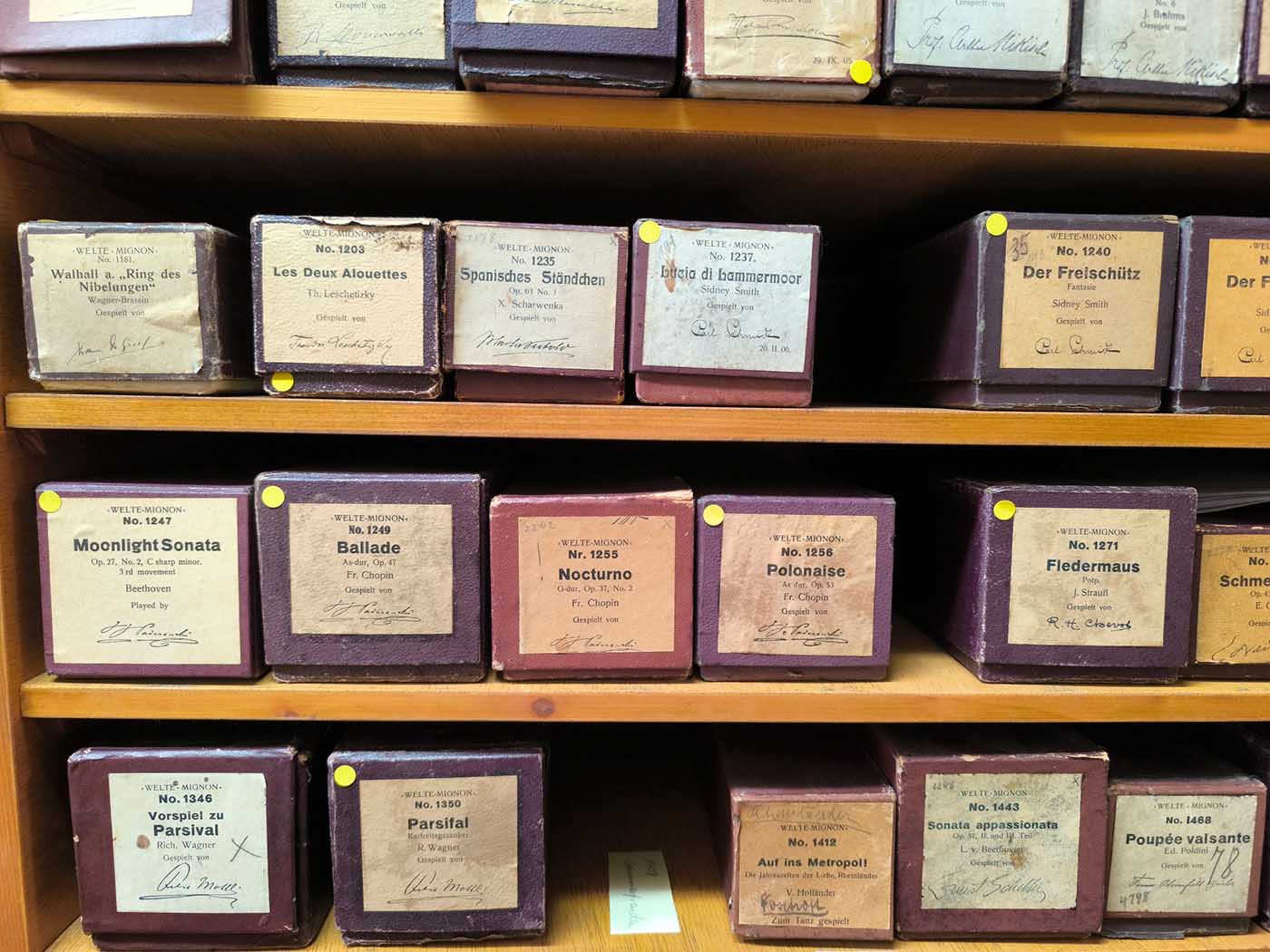 Heißt also: Die Inhalte dieser großen Notenrollensammlung des DMM, darunter allein tausend Exemplare der international erfolgreichen Freiburger Herstellerfirma M. Welte & Söhne, steht in Zukunft interessierten Nutzern aus Wissenschaft, Studium und Schule zur Verfügung. In zwei Arbeitsschritten, die der Förderverein in den Jahren 2024 und – nach einem entsprechenden Beschluss durch Vorstandschaft und Mitgliederversammlung – auch 2026 mit einem Betrag von insgesamt fast 30.000 Euro wesentlich mitfinanziert, werden diese frühen Datenträger als wissenschaftliche Quellen neu erschlossen. Sind sie doch ebenso Zeugnis der  Aufführungspraxis und Konsumgeschichte reproduzierter Musik wie sie ein wichtiges Kapitel baden-württembergischer Wirtschafts- und Musikgeschichte markieren. Die mit dem Projekt beauftragte Leipziger Musikwissenschaftlerin Claudia Nauheim gewährleistet durch ihre Arbeit die sachgerechte musikhistorische Verzeichnung der Stücke, Komponisten und Interpreten; seit Jahren beschäftigt sie sich mit diesem Thema und bereitet ihre Promotion dazu vor.